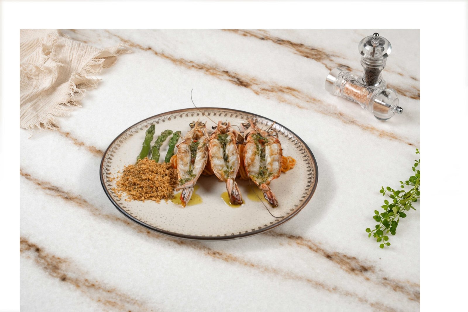 Jumbo karides, domates sos, spagetti, kuşkonmaz ile