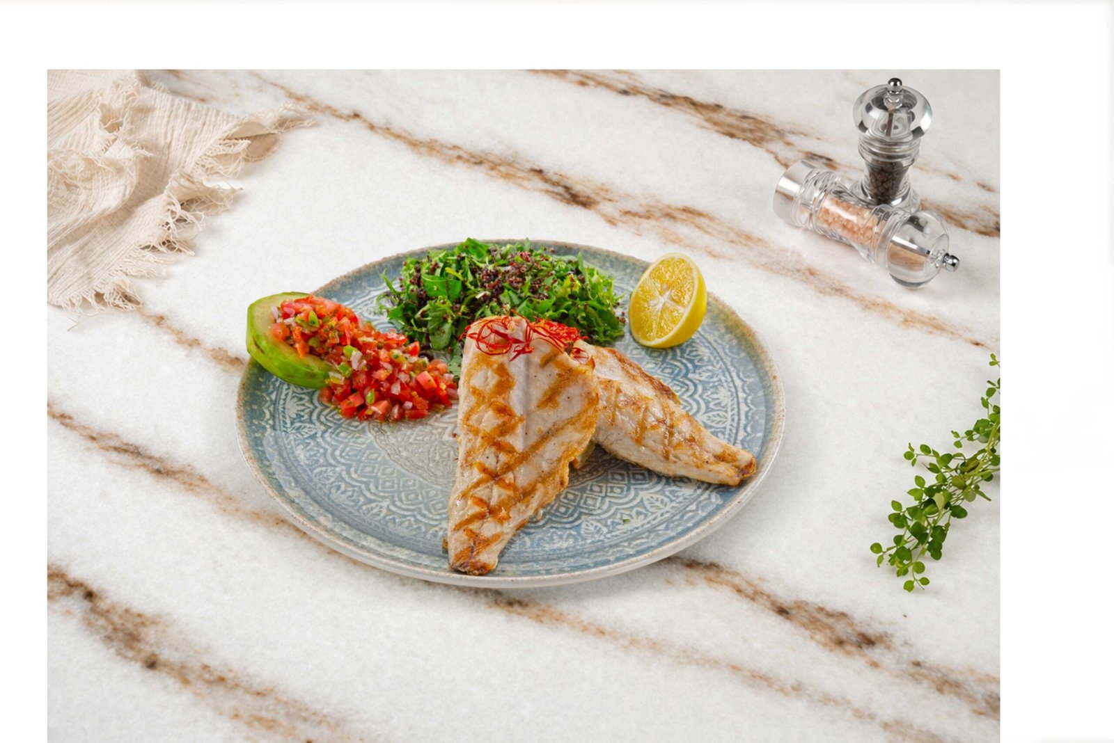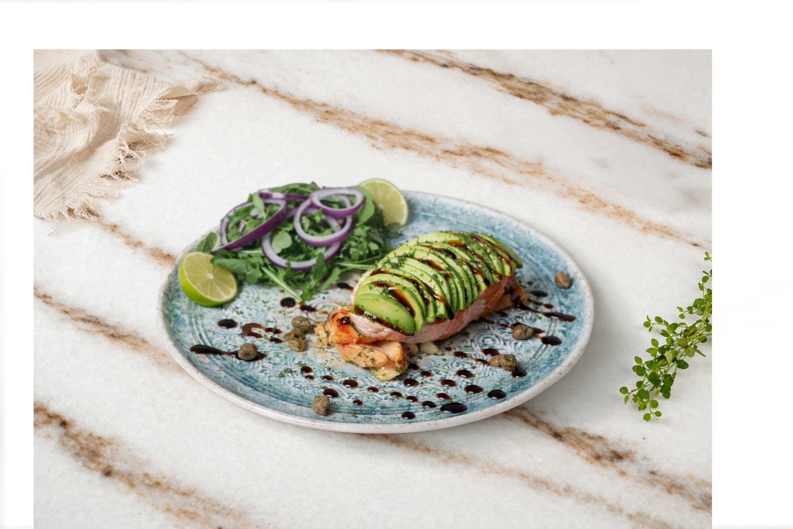 Izgara somon fileto, avokado, roma enginar, mor soğan, limon, kapari, dereotu, kinoalı roka salata