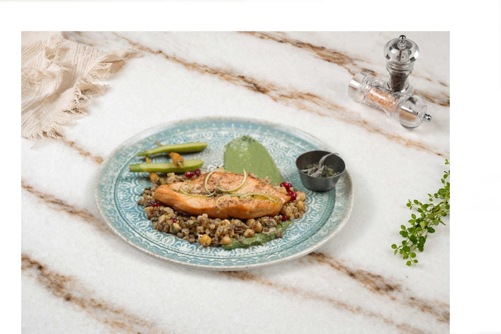 Somon fileto, tahıl mix, nar, haşlanmış nohut, fesleğen, kuşkonmaz püresi, mini sebzeler, tütsü, mini havuç, mini kabak ile