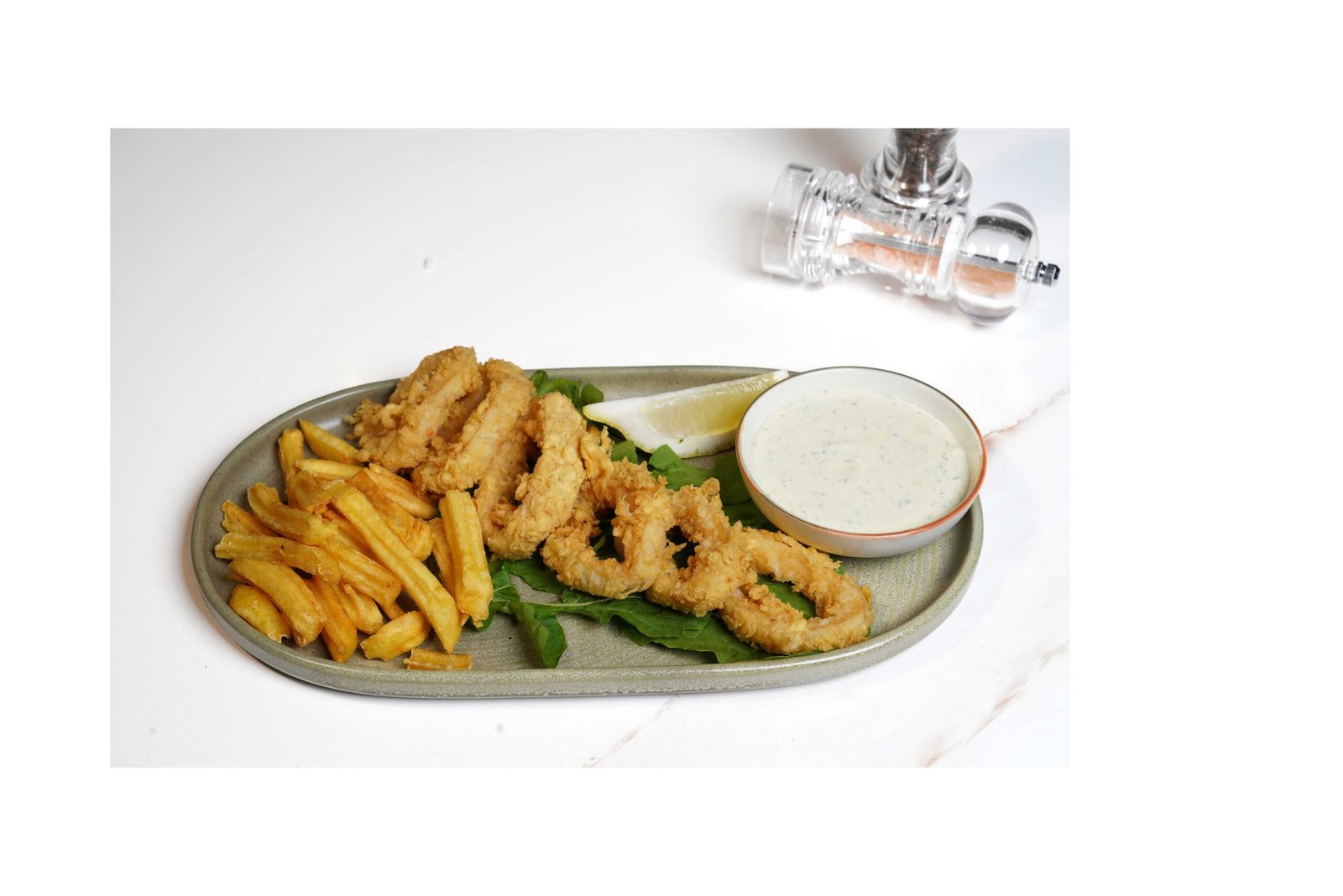 Roka, limon, tartar sos, kaşık patates ile