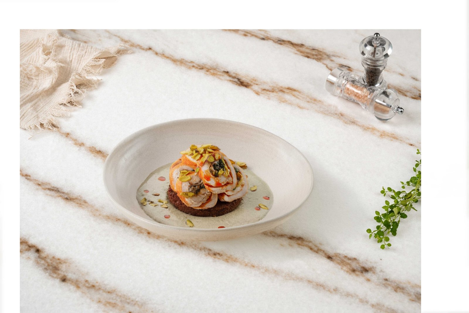 Tavuk fileto, mantar, ıspanak, beluga mercimek, antep fıstığı, kaşar peyniri, falafel kroket, ıspanak, krema sos ile