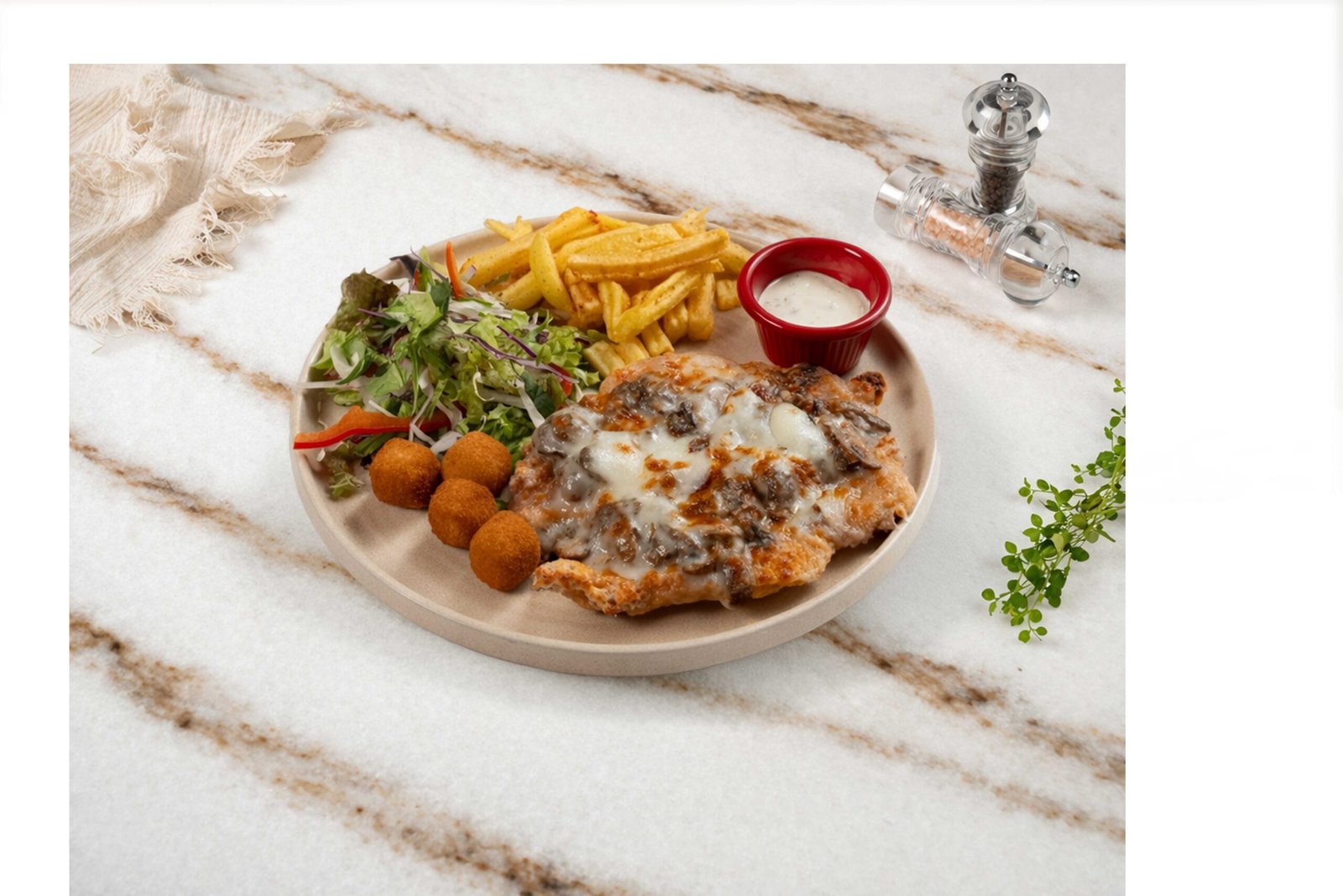 Şinitzel pane, tavuk fileto, mantar sote, kaşar peynir, kaşık patates, cheddar topu, maskolin, dip sos ile