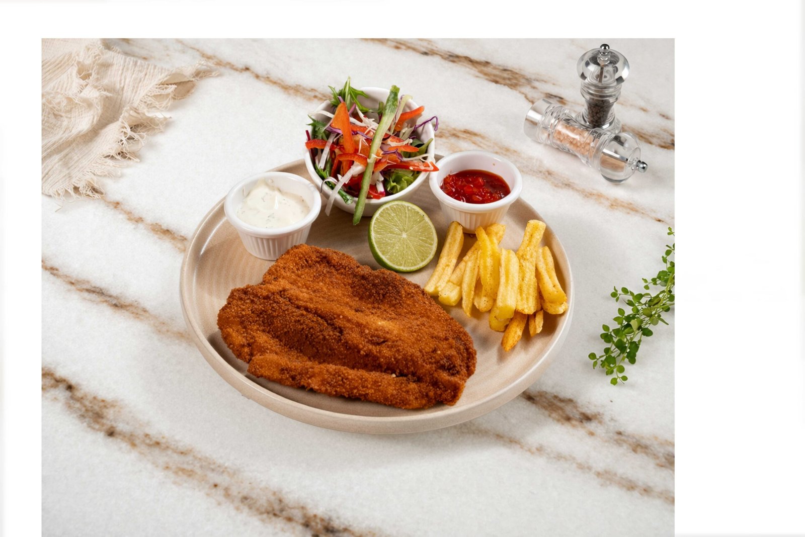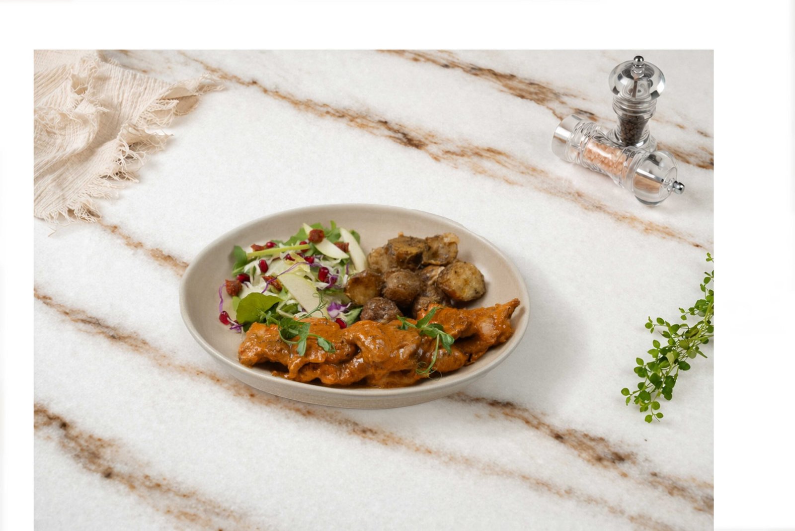 Tavuk but, grill sos, tavuk suyu, krema sos, lime, Waldorf salata, sote patates ile