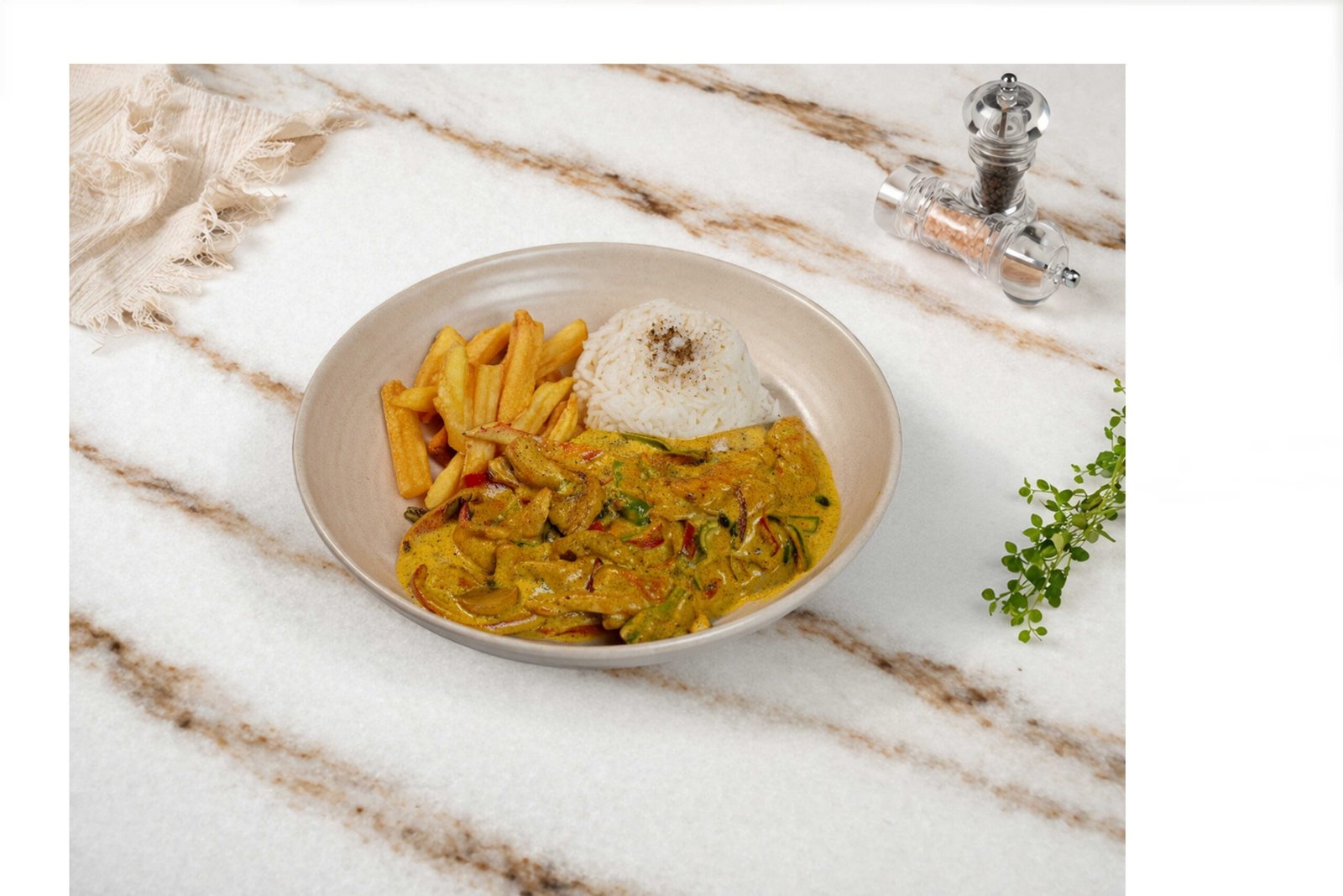 Jülyen tavuk, renkli biberler, mantar, krema sos, köri, zerdeçal, kaşık patates, pilav ile