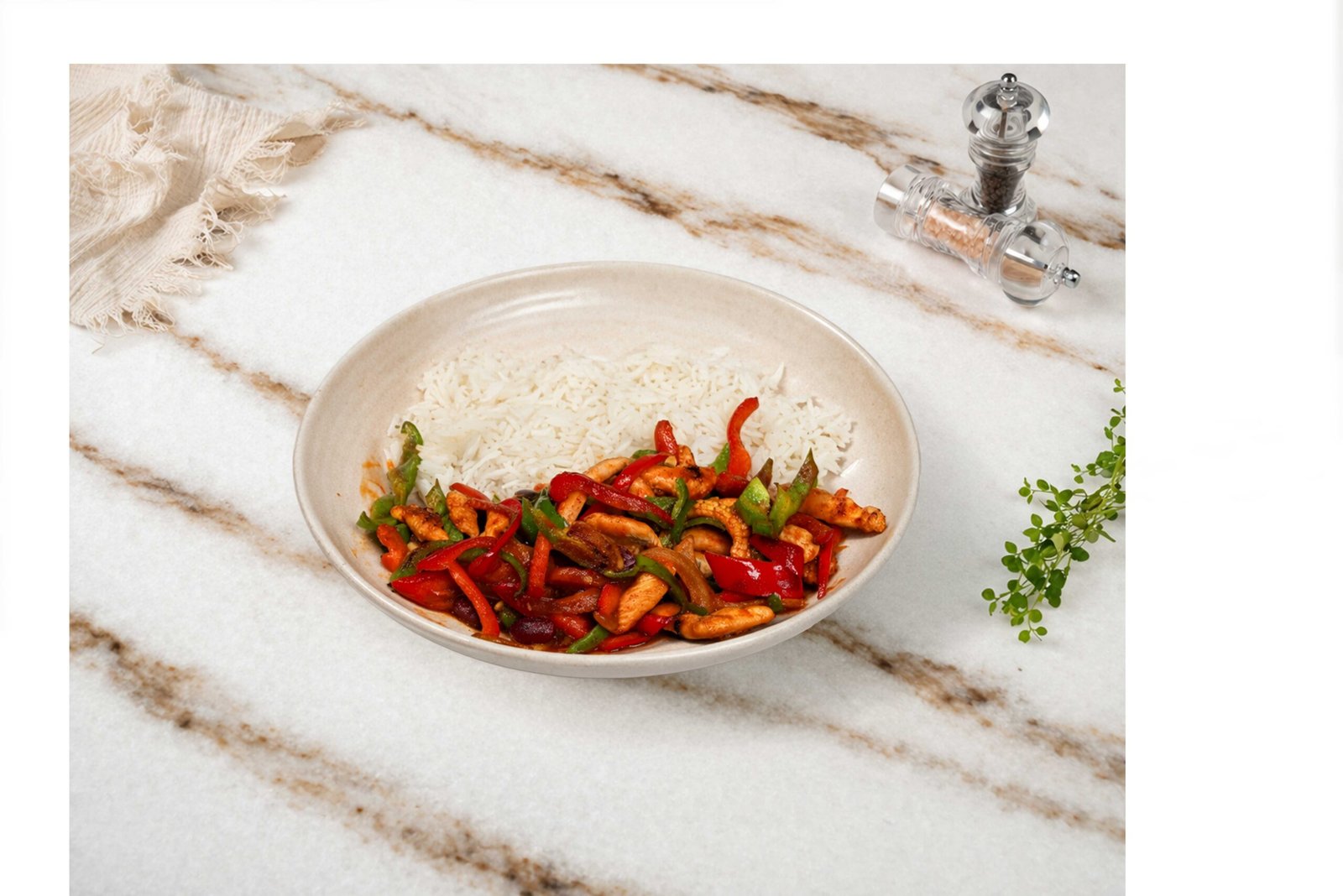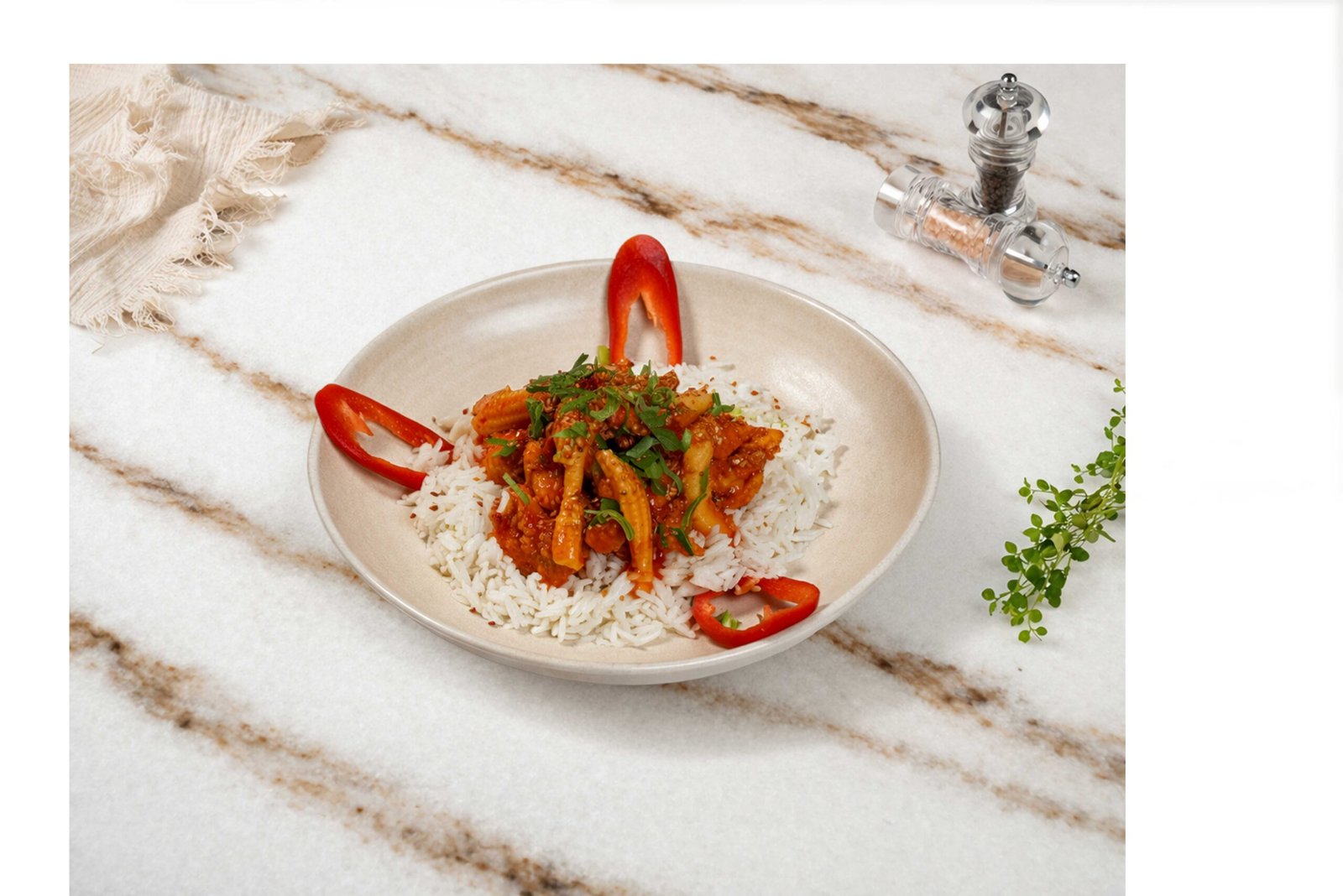 Jülyen tavuk, kapya biber, sweet chili sos, baby mısır, pilav ile