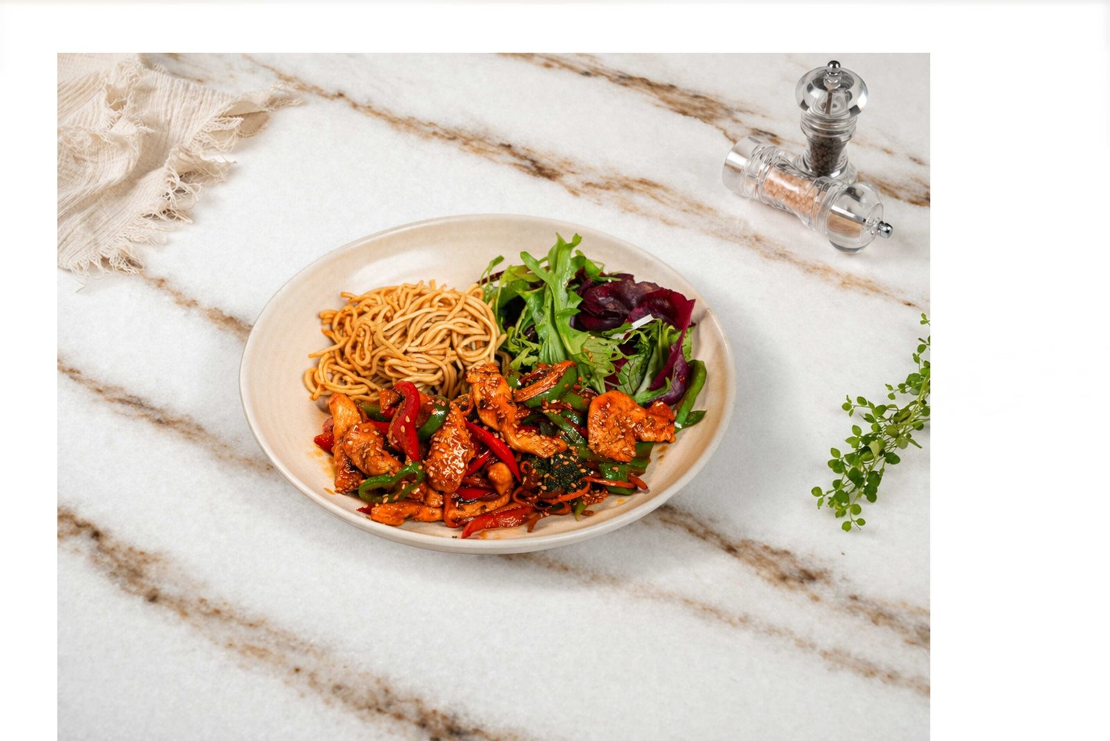 Jülyen tavuk, brokoli, kabak, havuç, renkli biberler, teriyaki sos, susam, sriracha sos, yanında soya soslu noodle, maskolin ile
