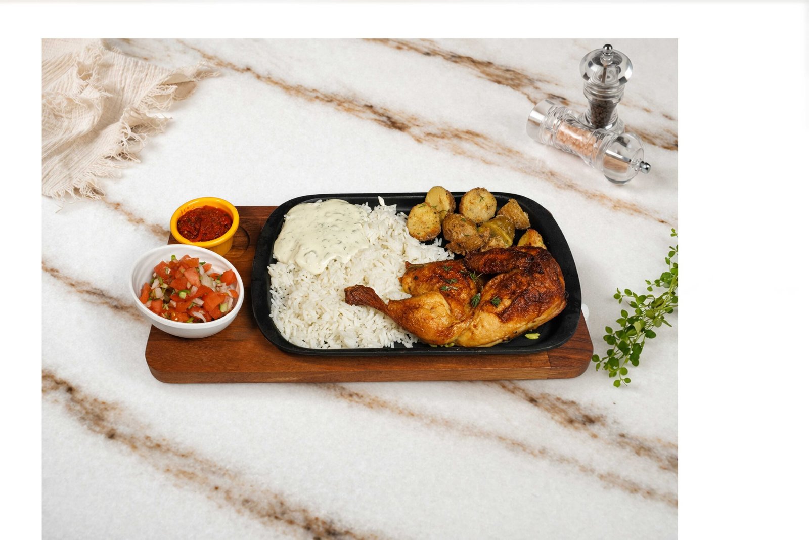 Yarım tavuk, fırın patates, yayla sos, pilav, kaşık salata ile