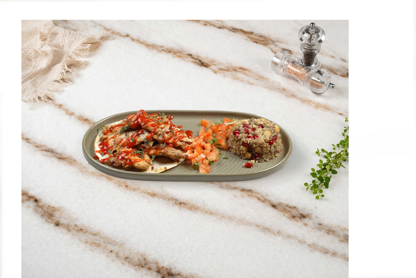 Tavuk but, tahıl mix, haşlanmış nohut, nar, fesleğen, tortilla ekmeği, fesleğenli domates, sriracha sos ile