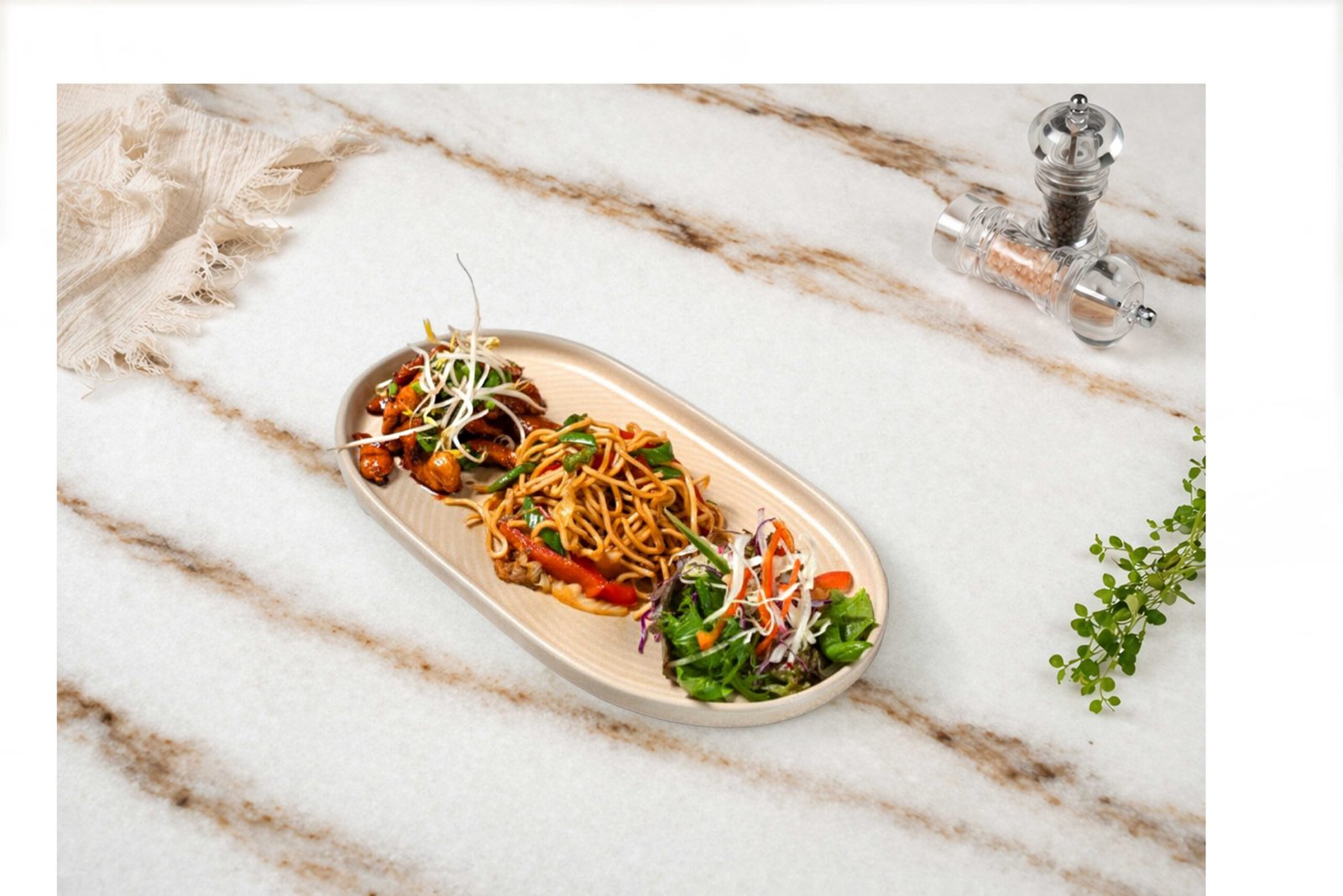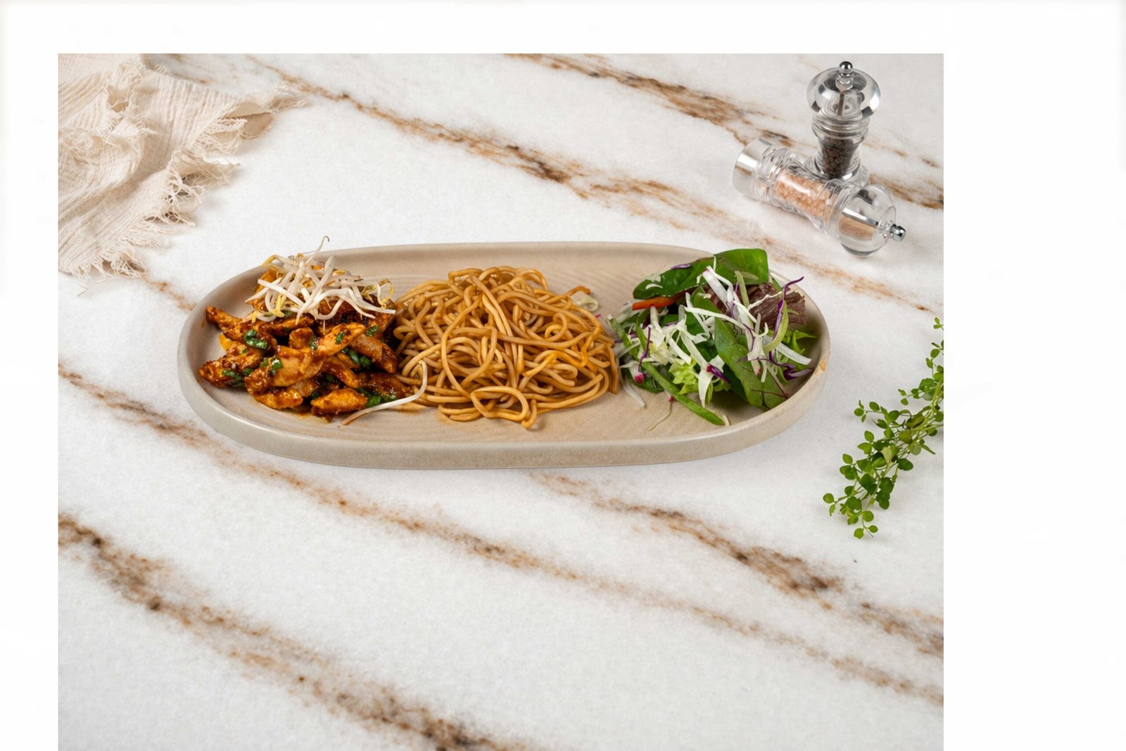 Jülyen tavuk, yangyom sos, sade noodle, maskolin, susam, taze soğan, havuç, kabak ile
