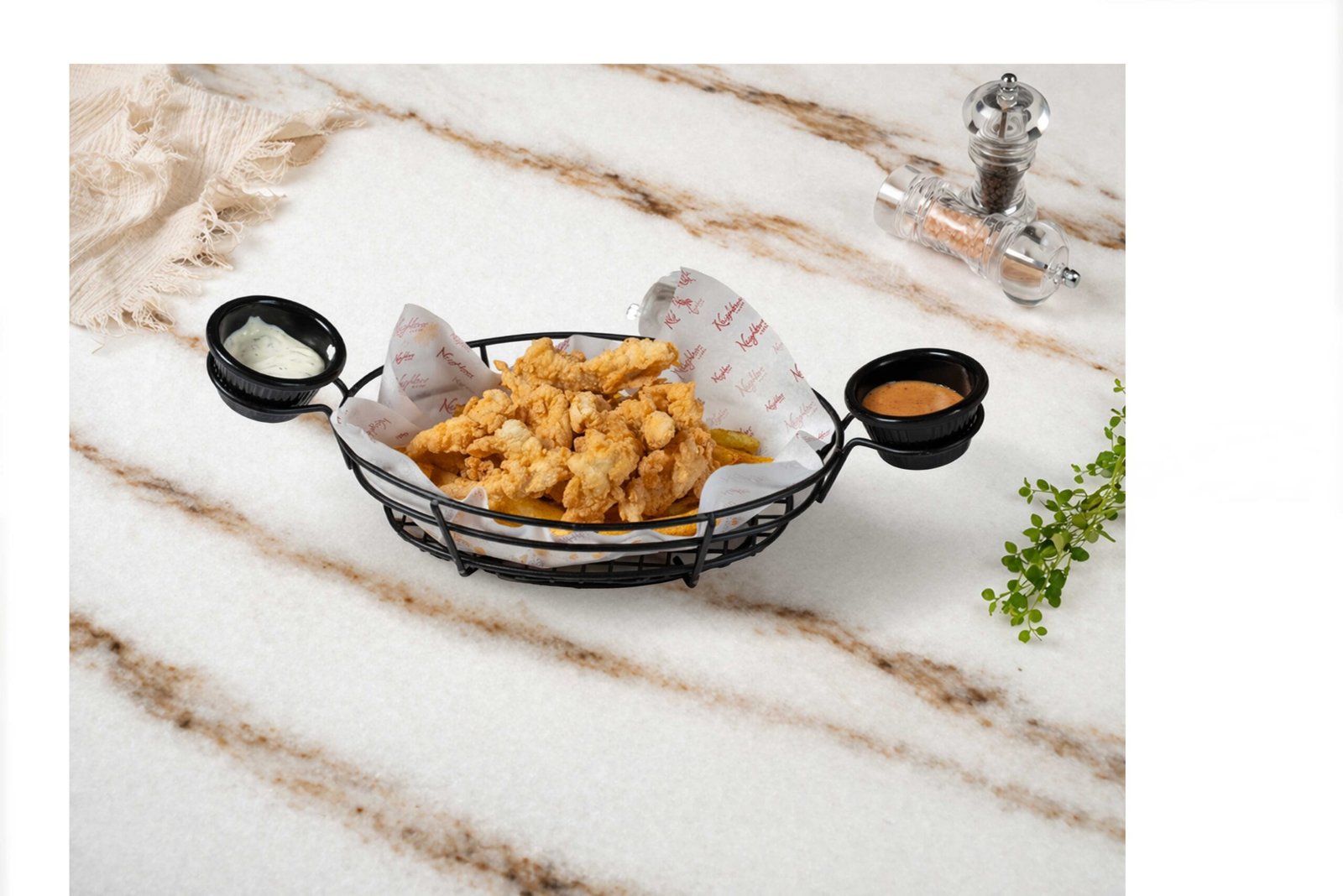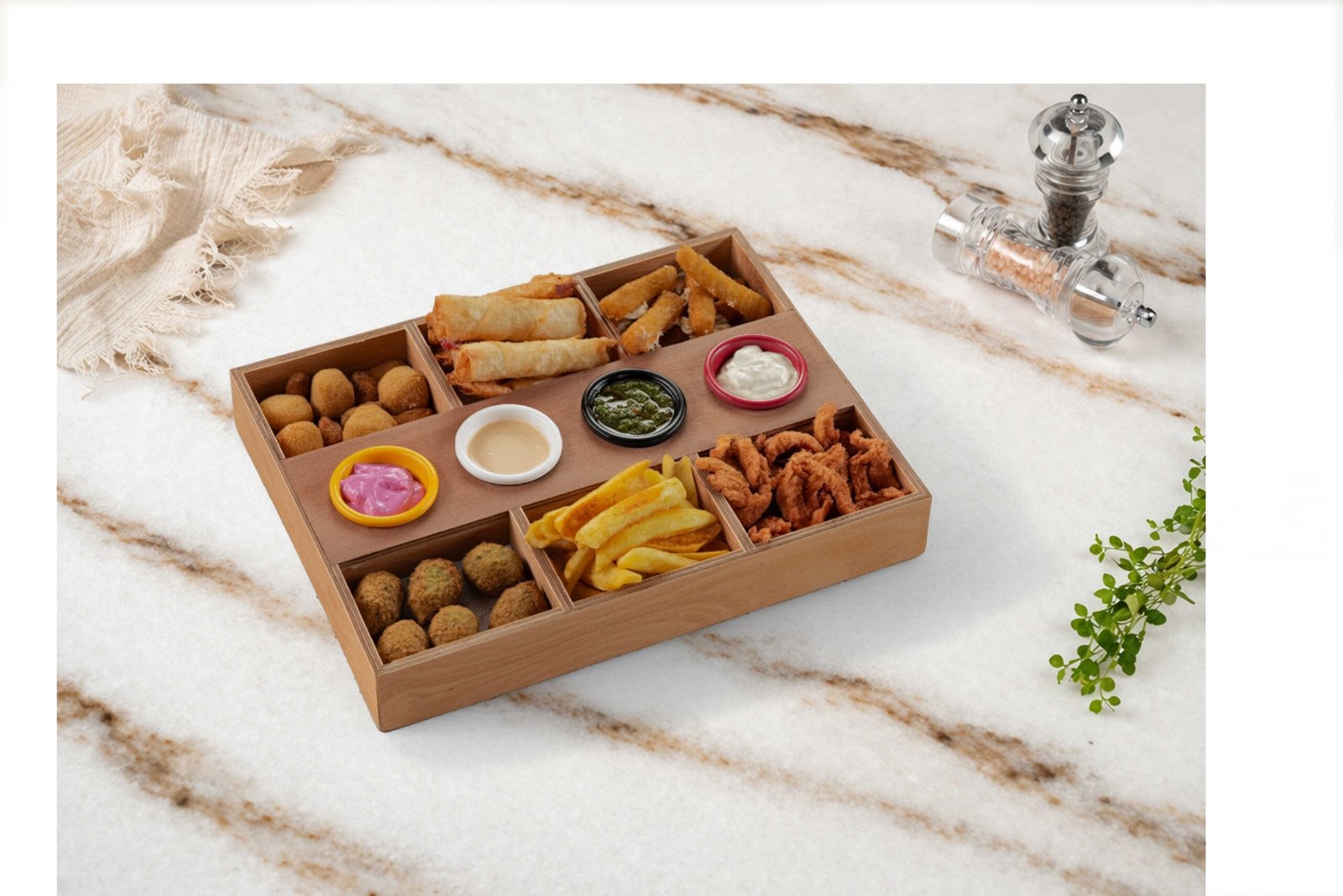 Kaşık patates, cheddar stick, mozzarella stick, cheddar topları, sigara böreği, paçanga böreği, çıtır midye, çıtır mac and cheese, mantar dolgulu falafel, cajun baharatlı çıtır tavuk, pancarlı dip sos, dinamit sos , honey mustard sos, sweet chili sos ile