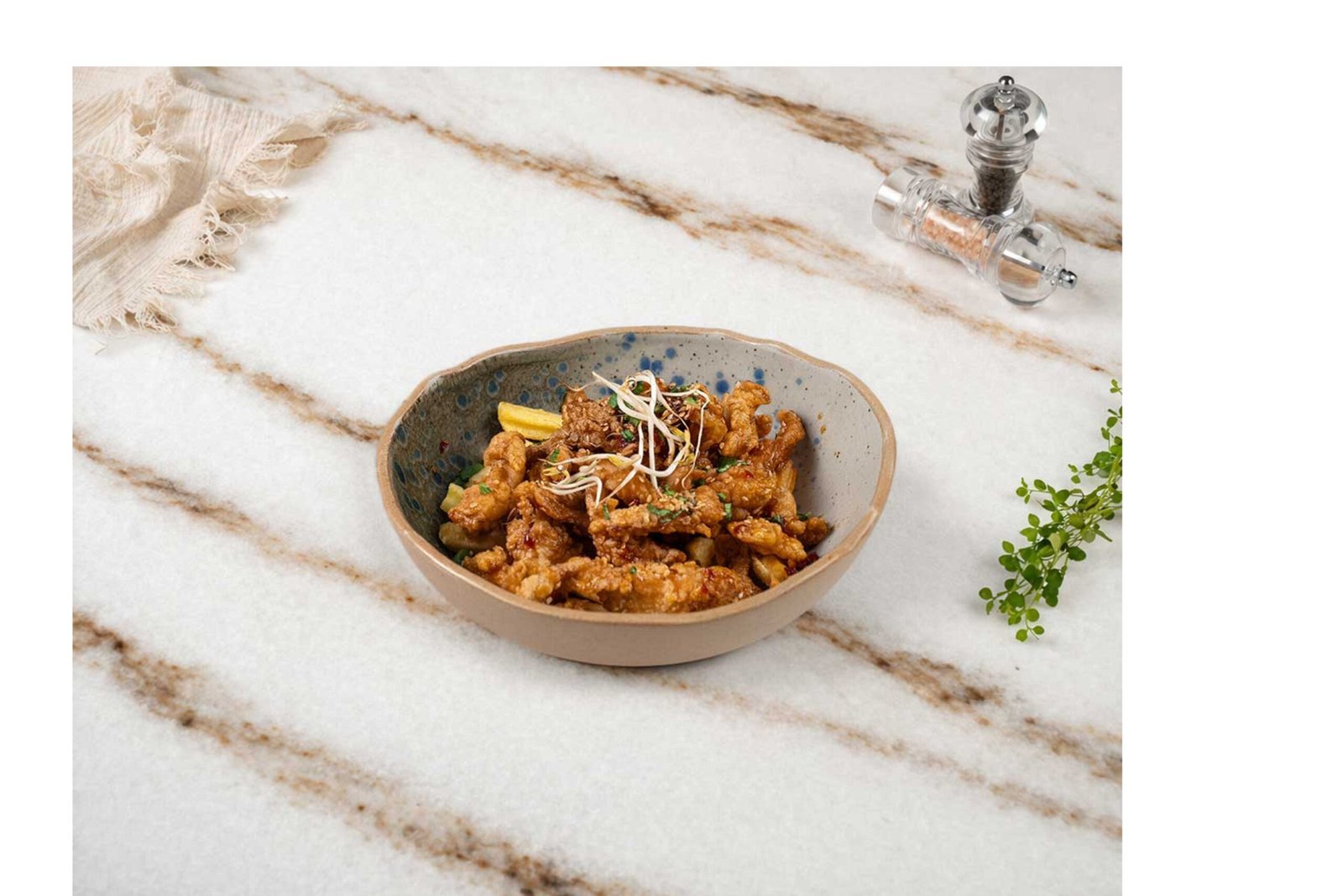 Jülyen tavuk, tempura karışımı, kaşık patates, dinamite sos ile