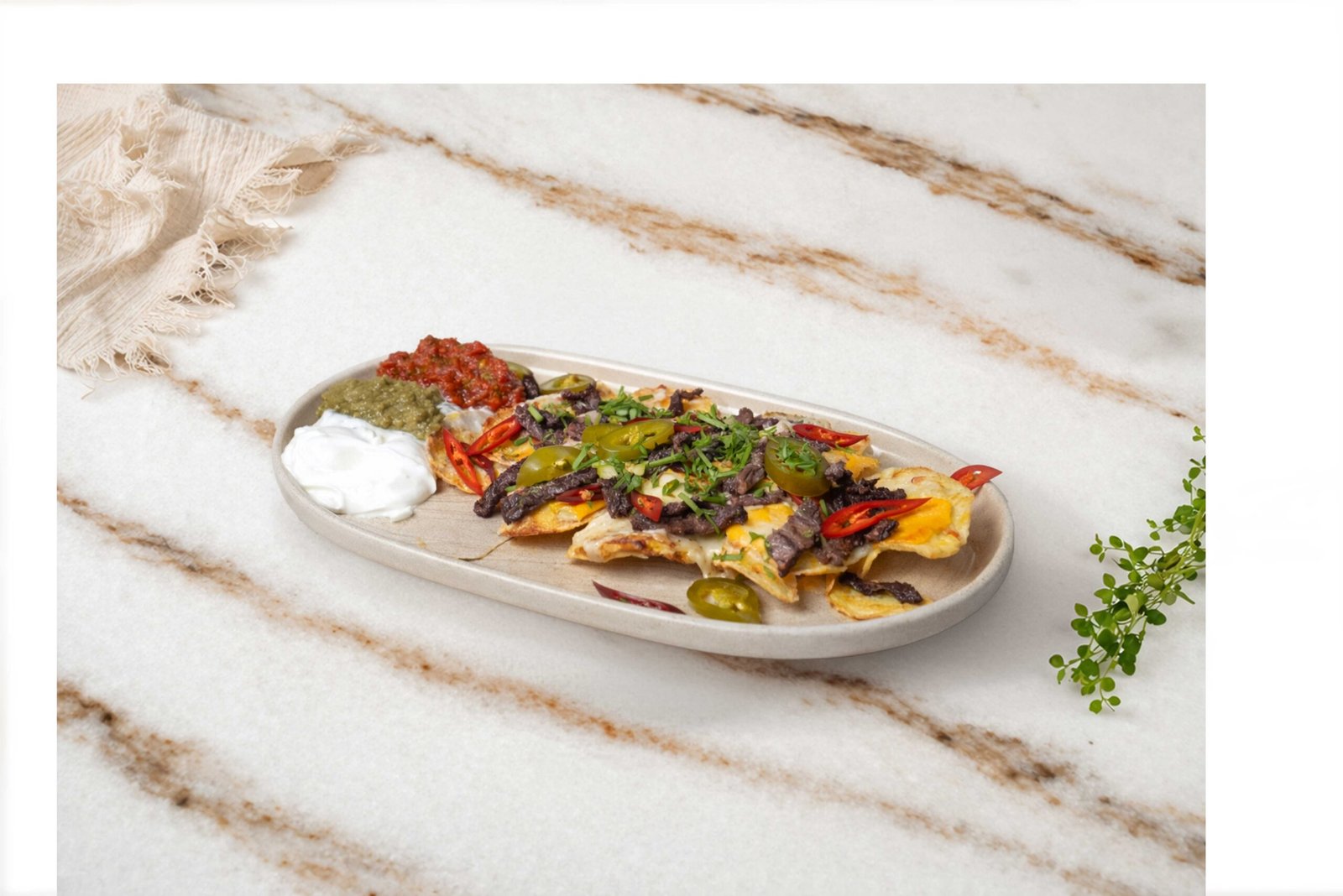 Et sote, Meksika fasulyesi, mısır, nachos cips, jalapeno biber, cheddar peyniri, kaşar peyniri, salsa sos, avokado sos, süzme yoğurt ile