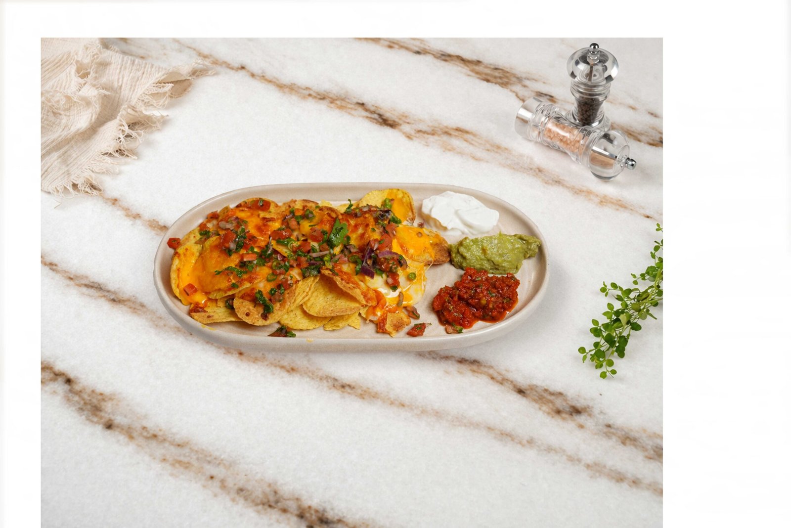 Nacho cips , kaşar , cheddar, pica da gallo, avokado sos , salsa sos , süzme yoğurt ile