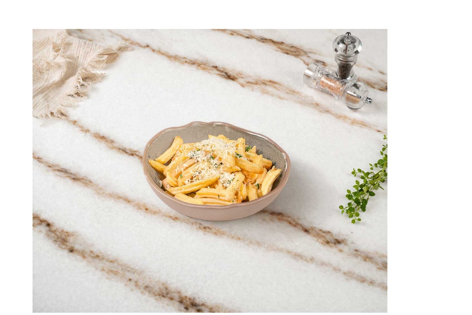 Kaşık patates, rendelenmiş parmesan, sarımsak sos, dinamite sos, dip sos ile