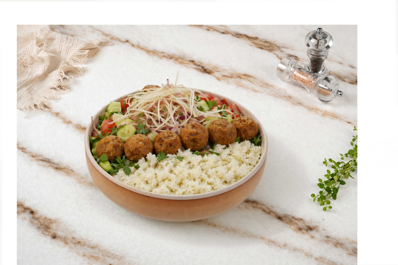 Falafel, maskolin, çoban salata, tulum peyniri, soya filizi ile