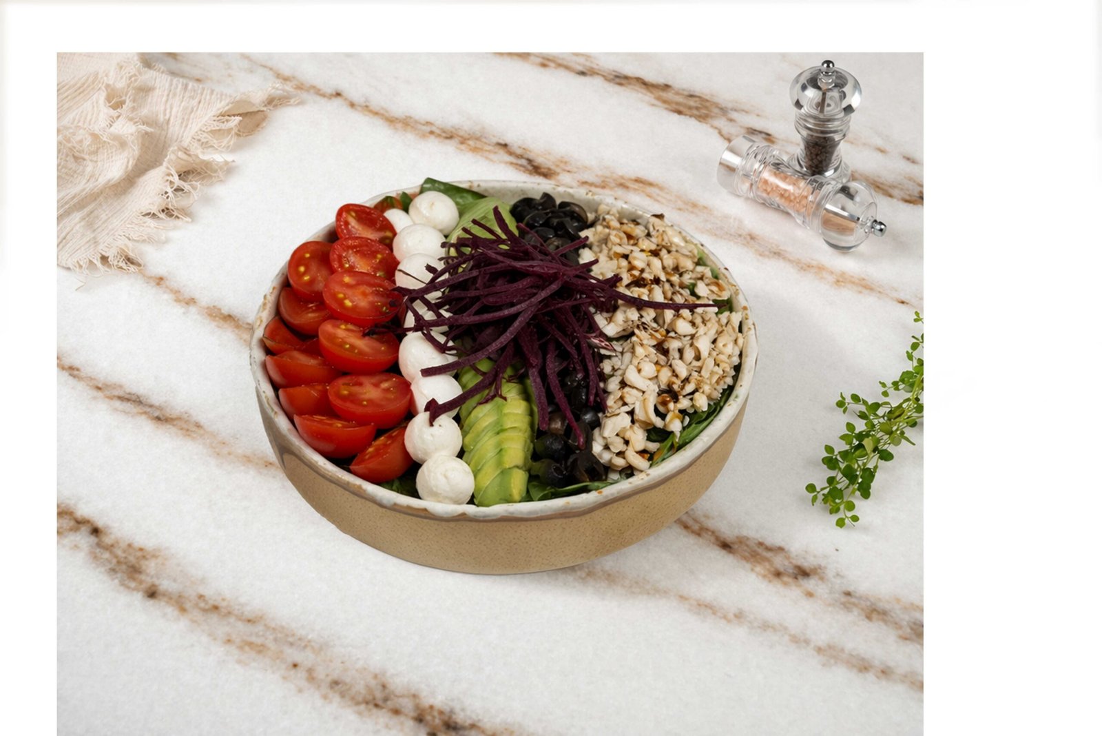 Avokado, maskolin, cherry domates, top peynir, siyah zeytin, ceviz ile