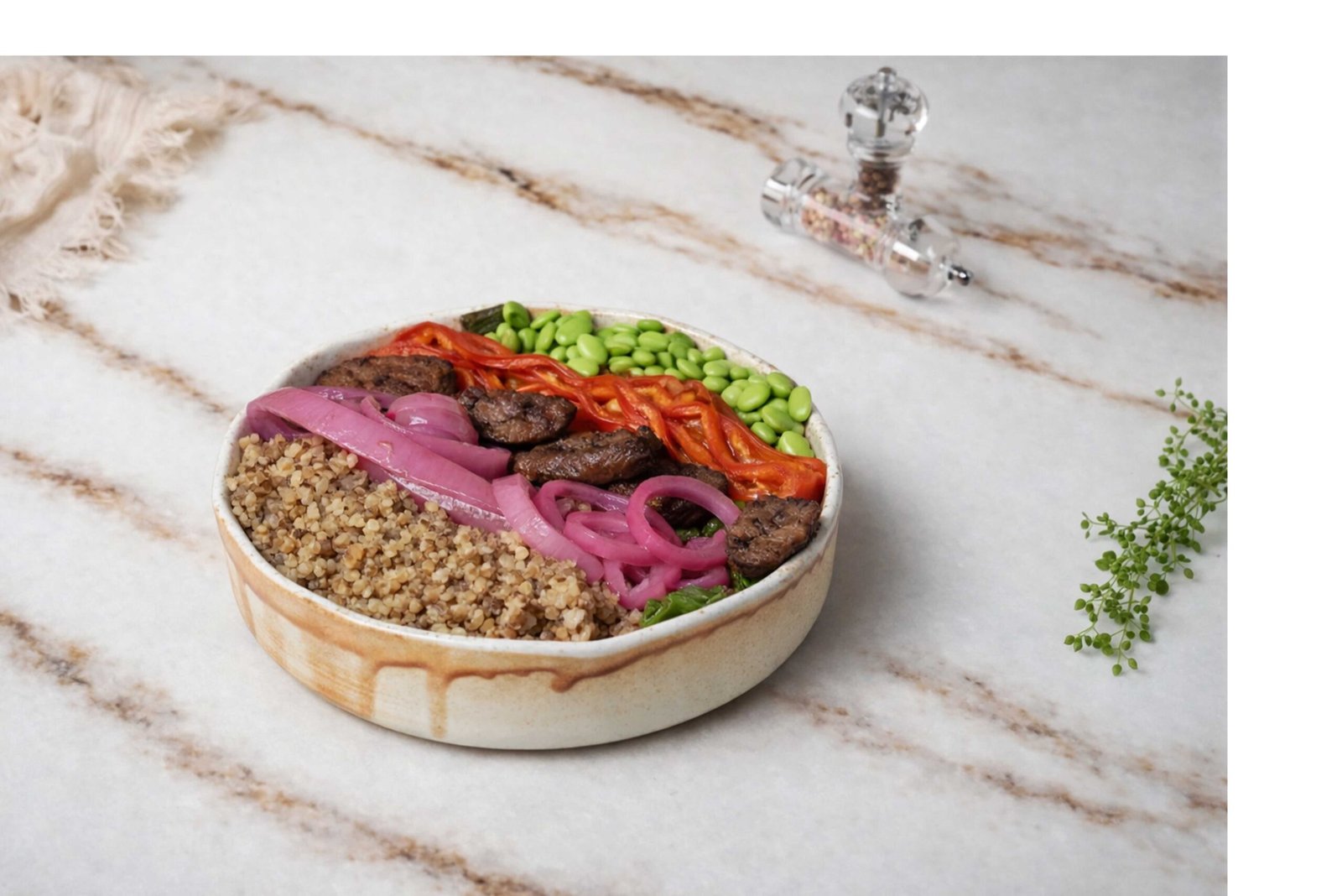 Izgara köfte, maskolin, közlenmiş biber, edamame fasulye, tahıl mix, mor soğan ile