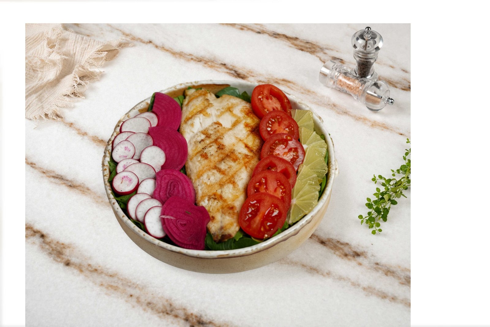 Izgara levrek, roka, limon, kırmızı turp, çeri domates, mor soğan ile