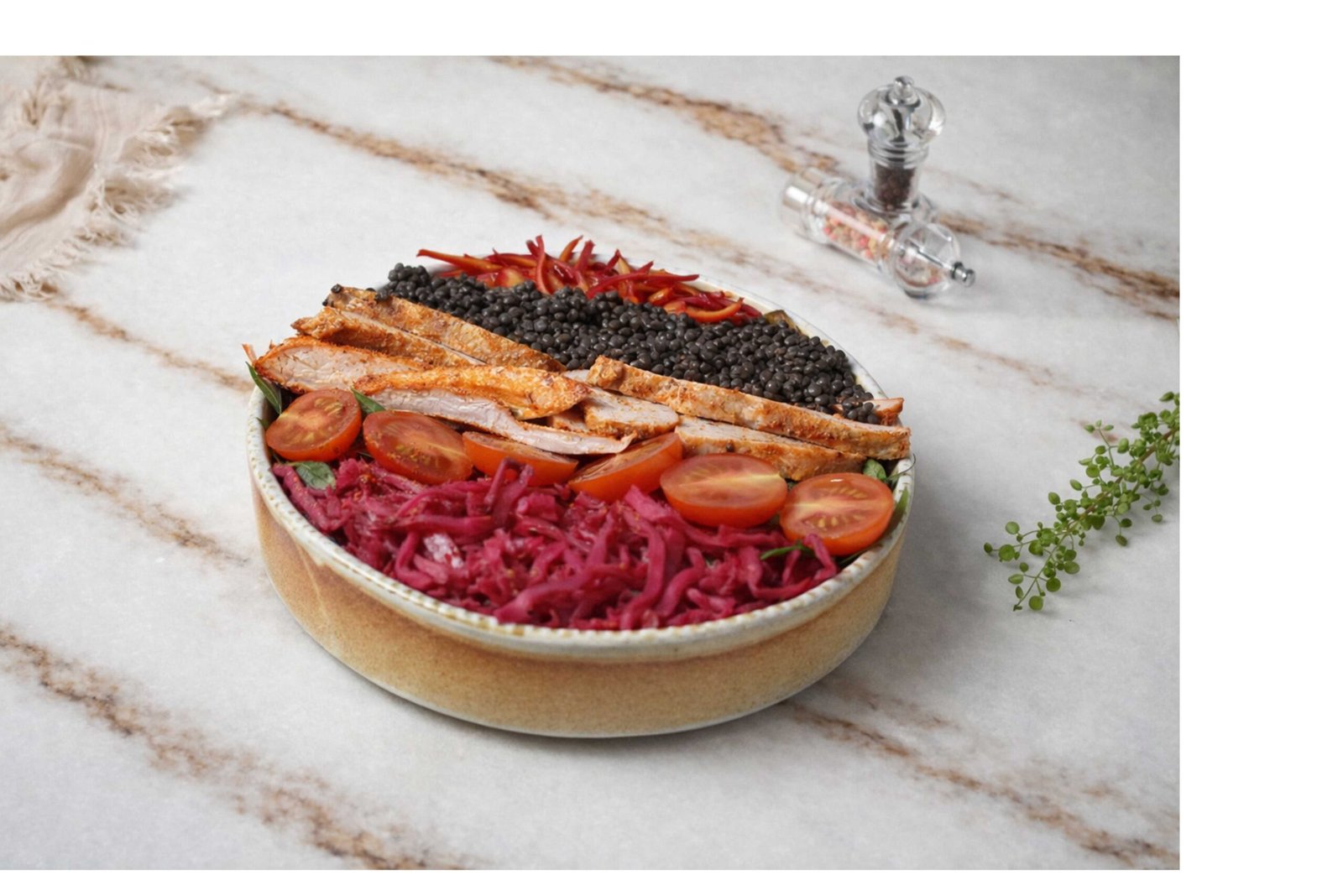 Izgara tavuk, cherry domates, beluga mercimek, kapya biber ile