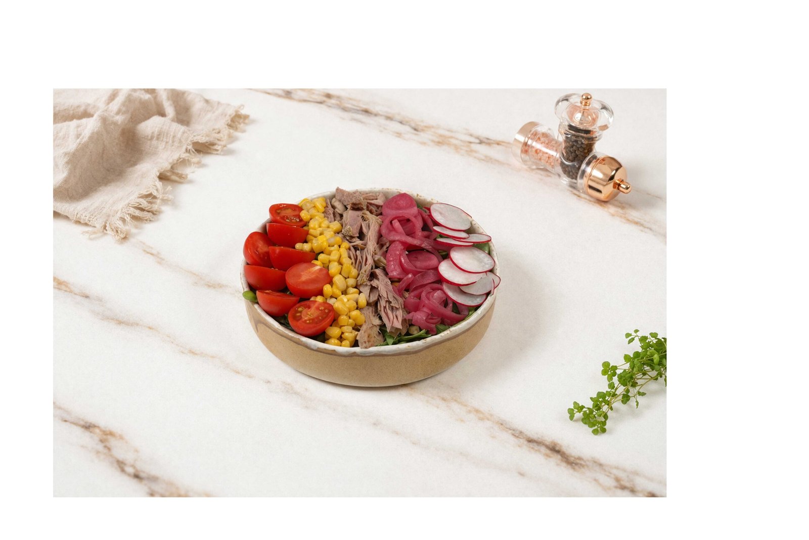 Iceberg, roka, ton balığı, mor soğan turşusu, turp, çeri domates, mısır ile