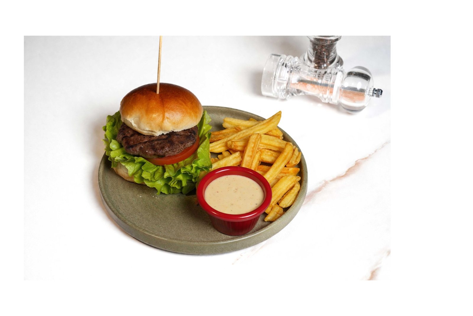 Burger köftesi, marul, domates, turşu, kaşık patates, honey master sos ile