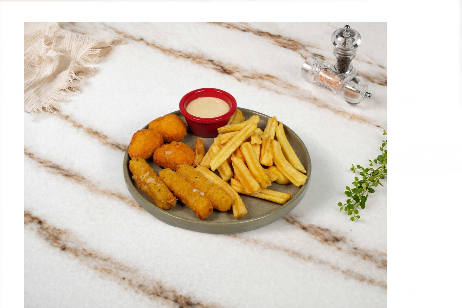 3 adet nugget, 3 adet mozzarella, kaşık patates, honey master sos ile