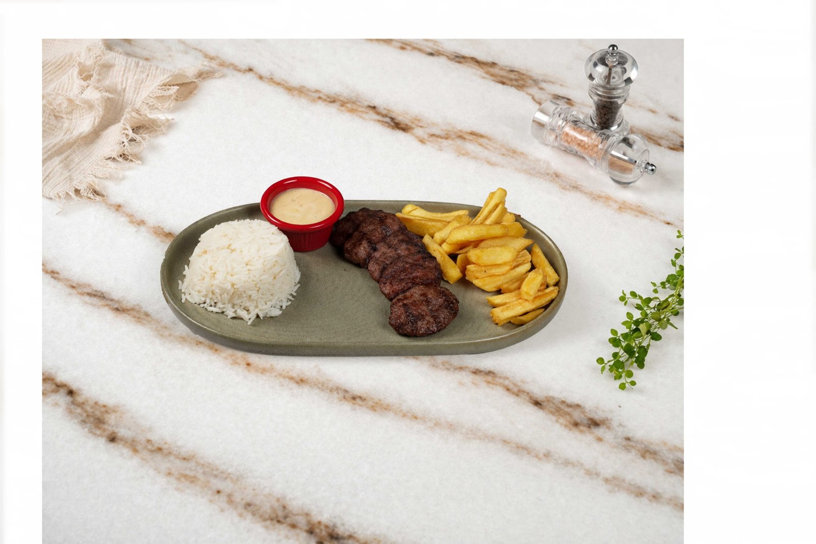 5 adet köfte, pilav, kaşık patates ile