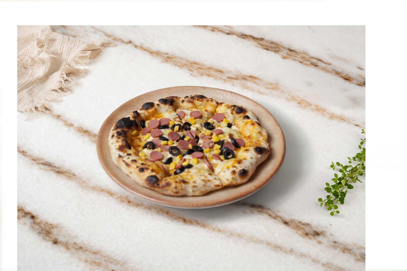 Pizza sos, mozzarella, sosis, zeytin, mısır