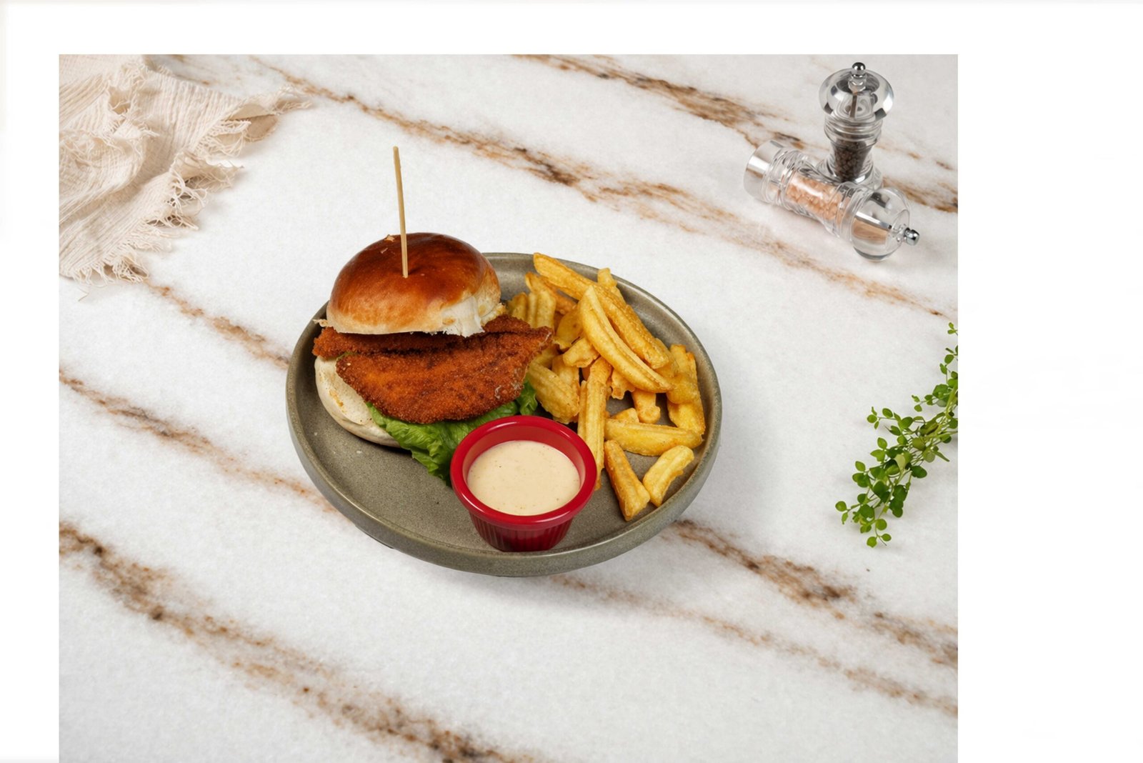 Panelenmiş tavuk, marul, domates, turşu, kaşık patates, honey master sos ile