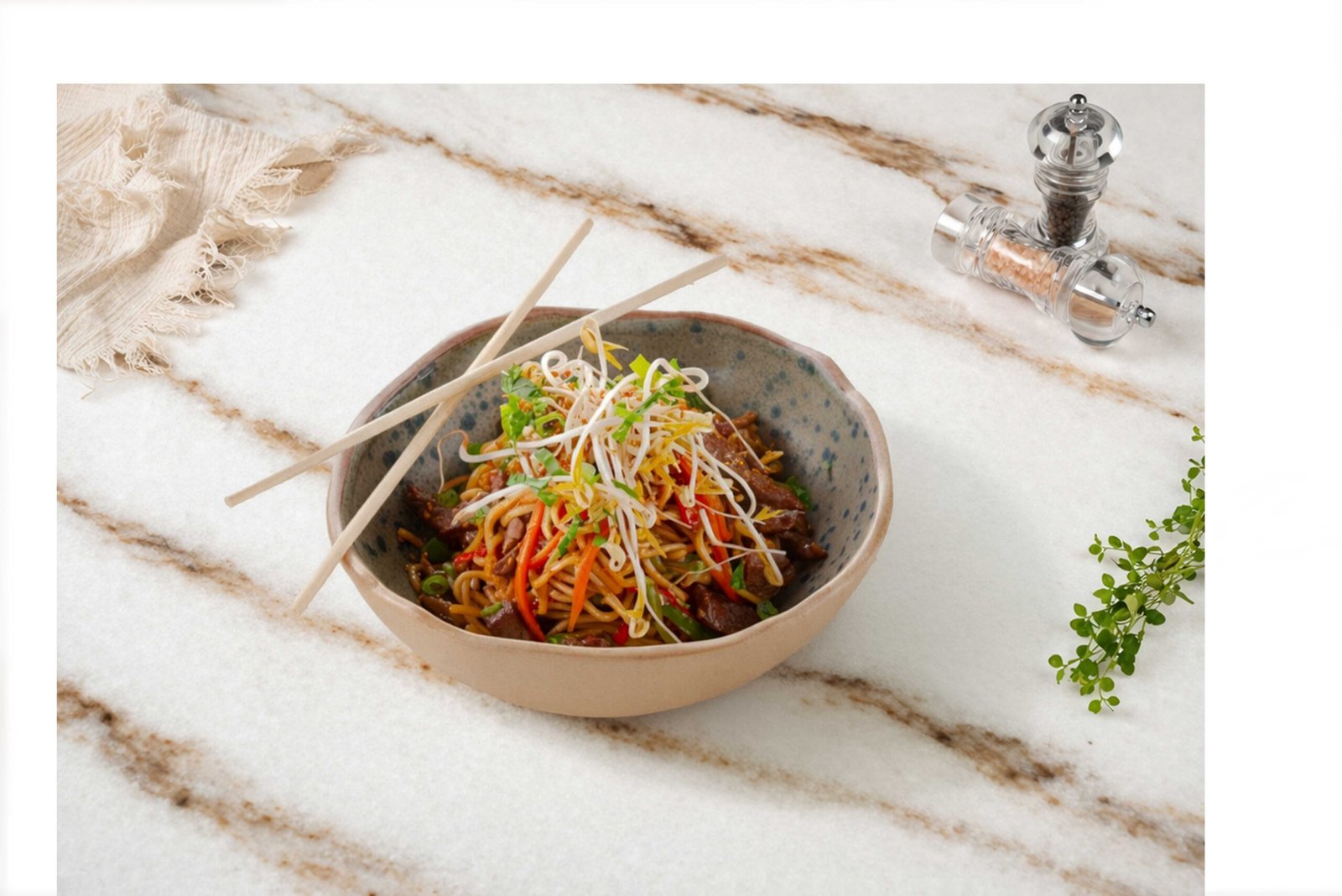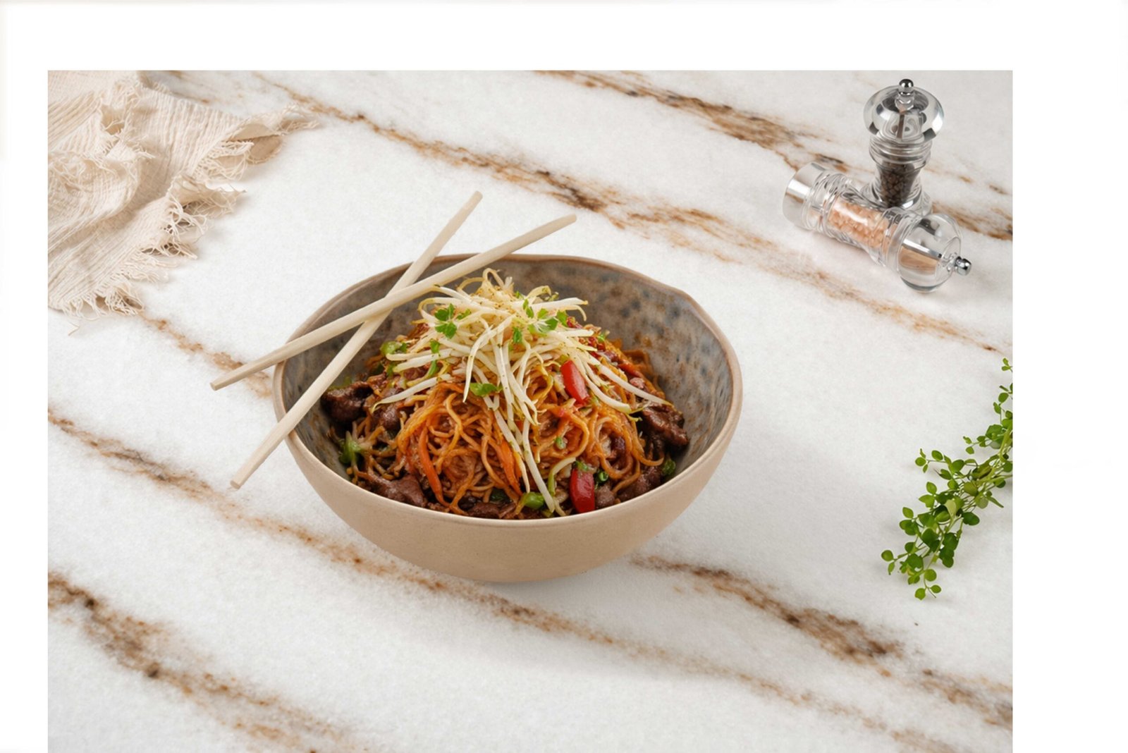 Jülyen bonfile, noodle makarna, soya sos, susam yağı, teriyaki sos, renkli biberler, beyaz lahana, kabak, havuç, istiridye mantarı ve üzerine soya filizi, taze soğan, baby mısır ,maydanoz, susam ile