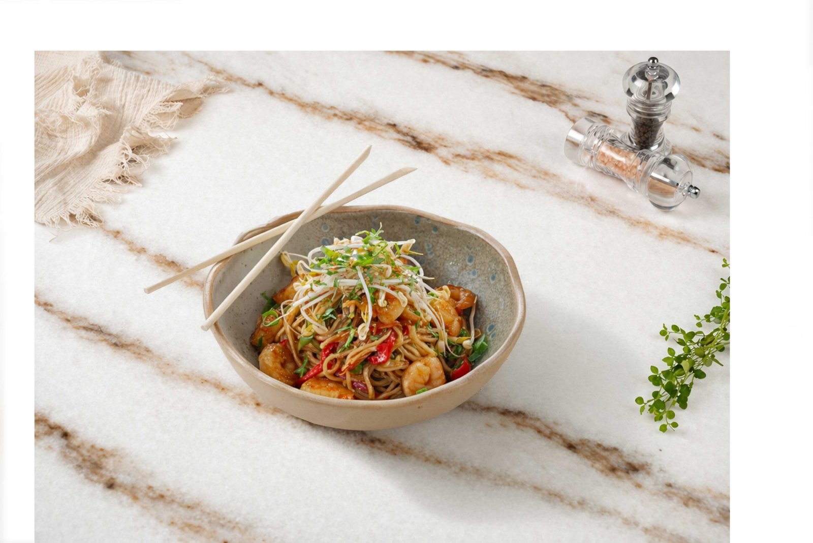 Karides, noodle makarna, soya sos, susam yağı, teriyaki sos, renkli biberler, beyaz lahana, kabak, havuç, istiridye mantarı ve üzerine soya filizi, taze soğan,baby mısır, maydanoz, susam ile