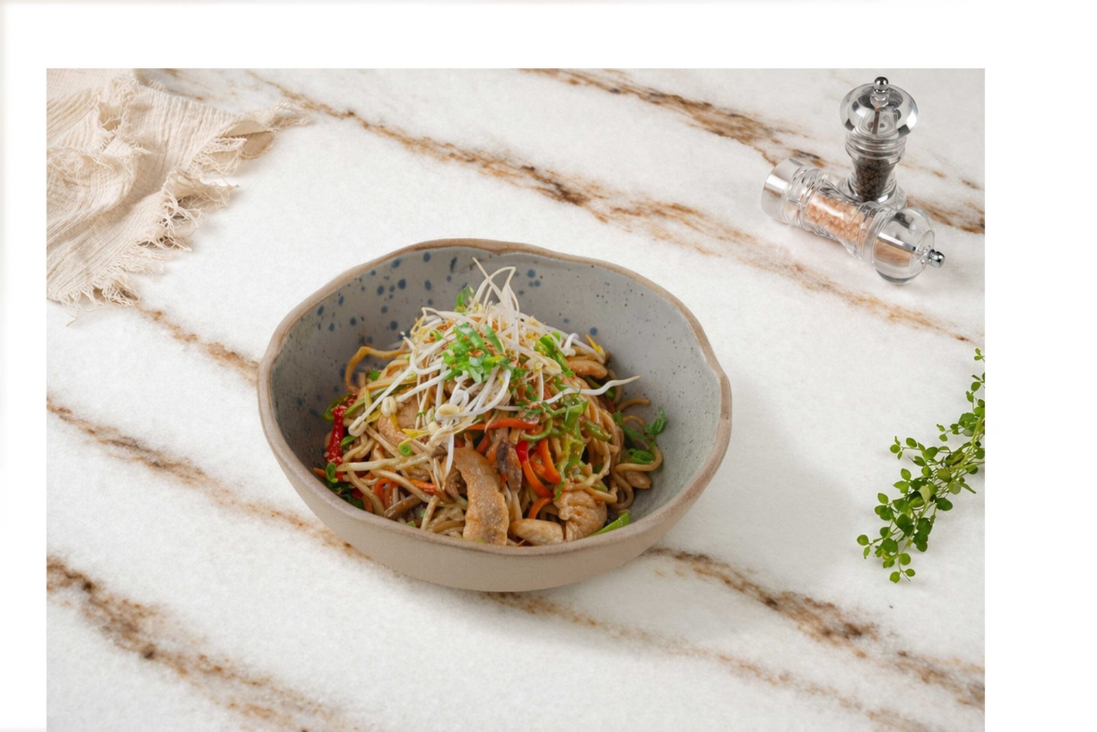 Jülyen tavuk, noodle makarna, soya sos, susam yağı, teriyaki sos, renkli biberler, beyaz lahana, kabak, havuç, istiridye mantarı ve üzerine soya filizi, taze soğan, baby mısır, maydanoz, susam ile