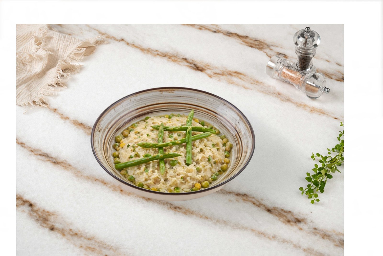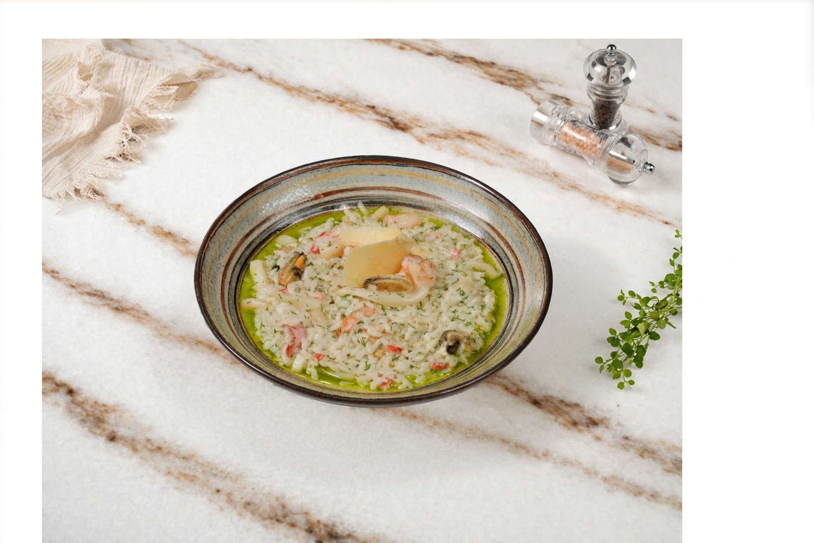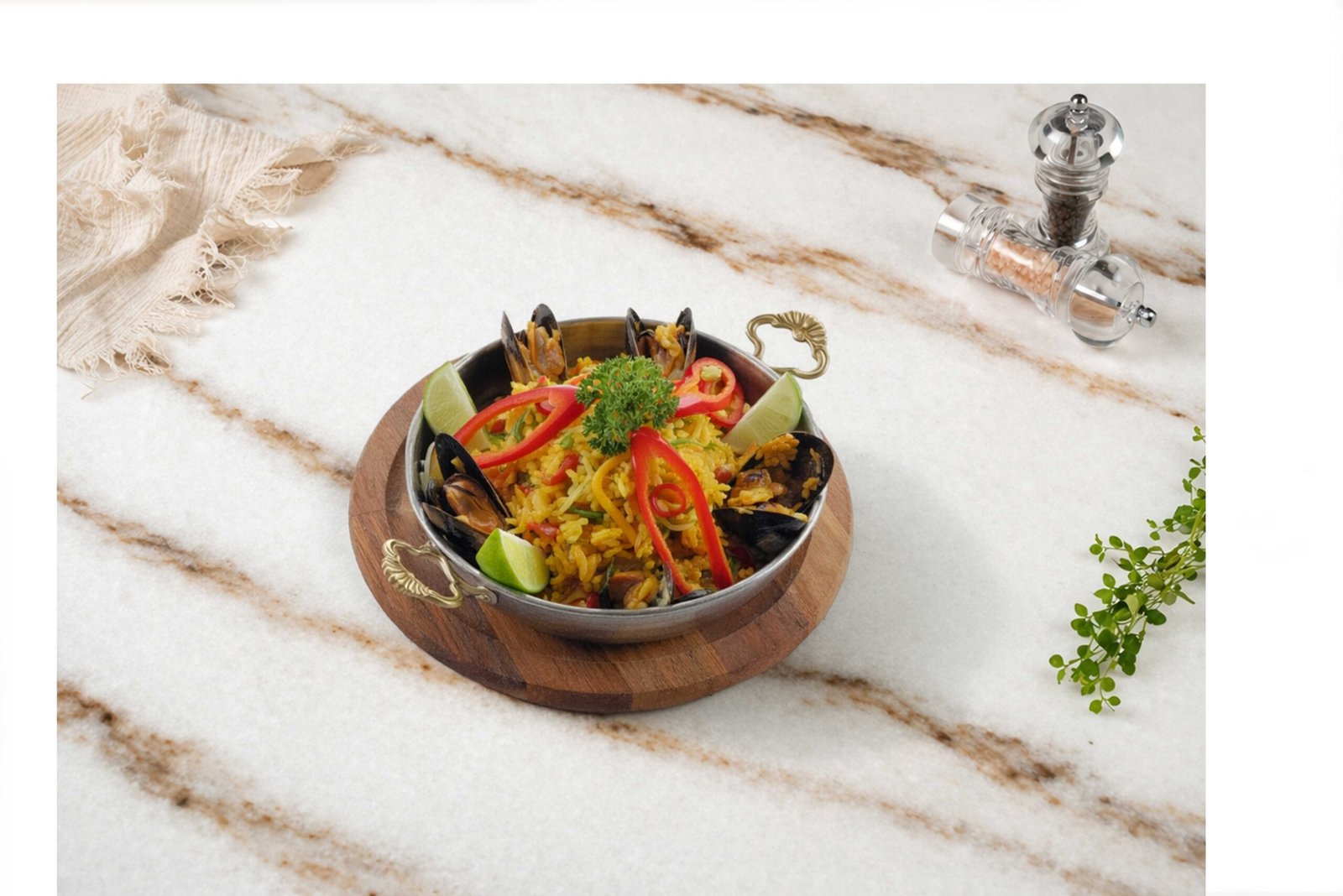 Kalamar, karides, kabuklu midye, tavuk, bezelye, mısır, renkli biberler, lime limon, taze soğan , tereyağı, parmesan peyniri, krema, dereotu ile