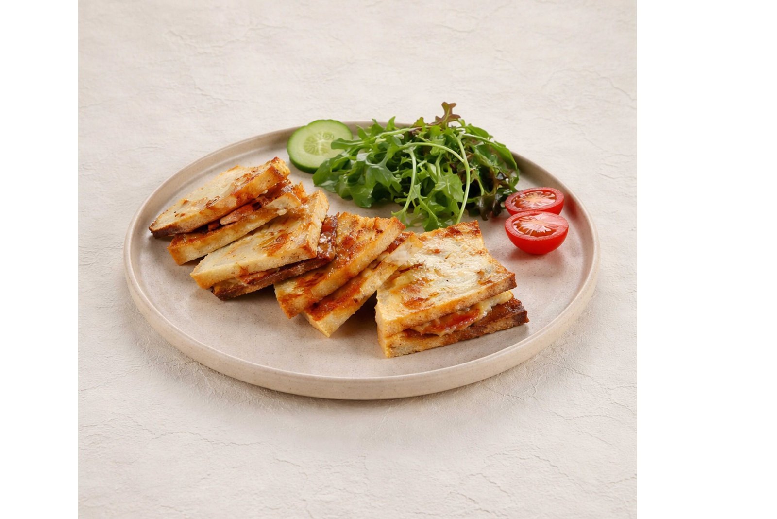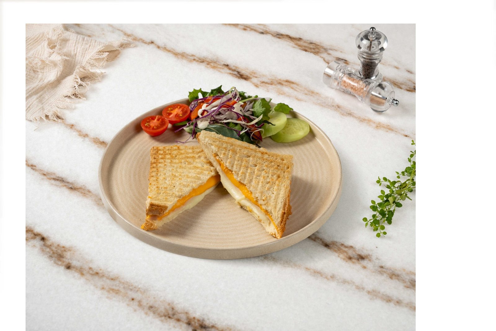 Tost ekmeği, kaşar peyniri, cheddar peyniri, hindi jambon, maskolin, çeri domates, salatalık ile