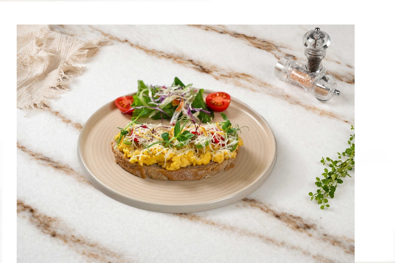 Tam buğday ekmeği, avokado, scramble yumurta, limon kabuğu, çeri domates, tulum peyniri, maskolin, kıtır, tereyağı, krema. ile