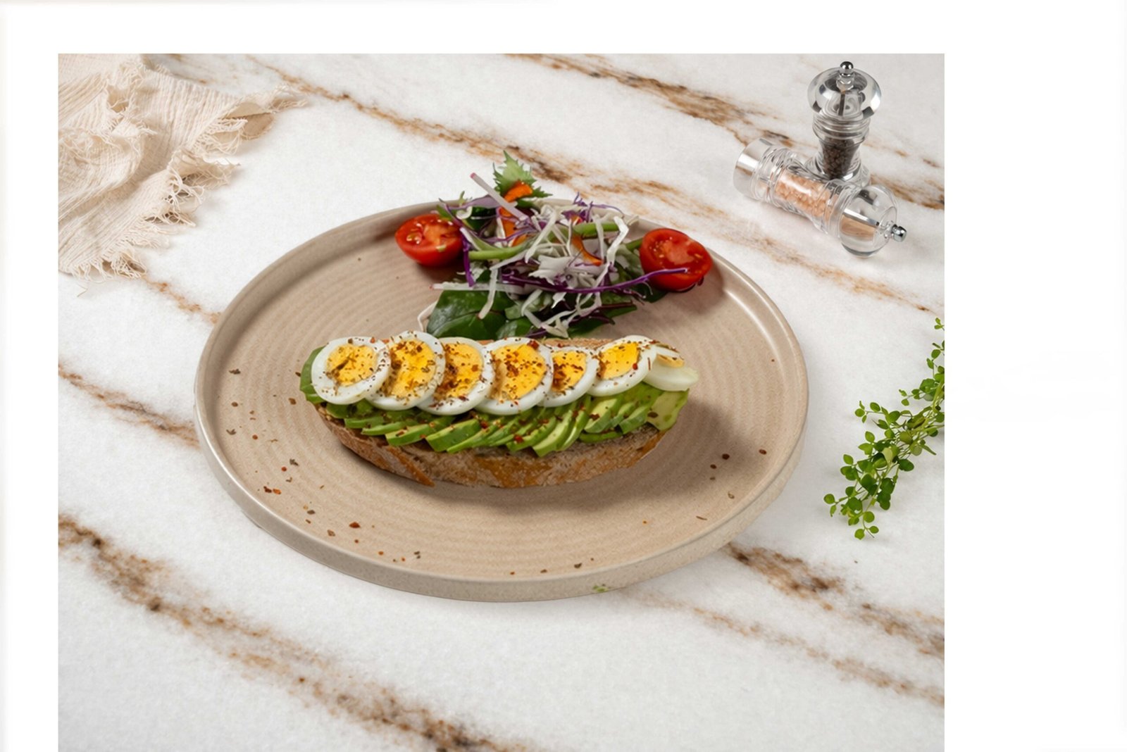 Tam buğday ekmeği, avokado, haşlanmış yumurta, kuru kekik, pul biber, maskolin, salatalık, çeri domates ile