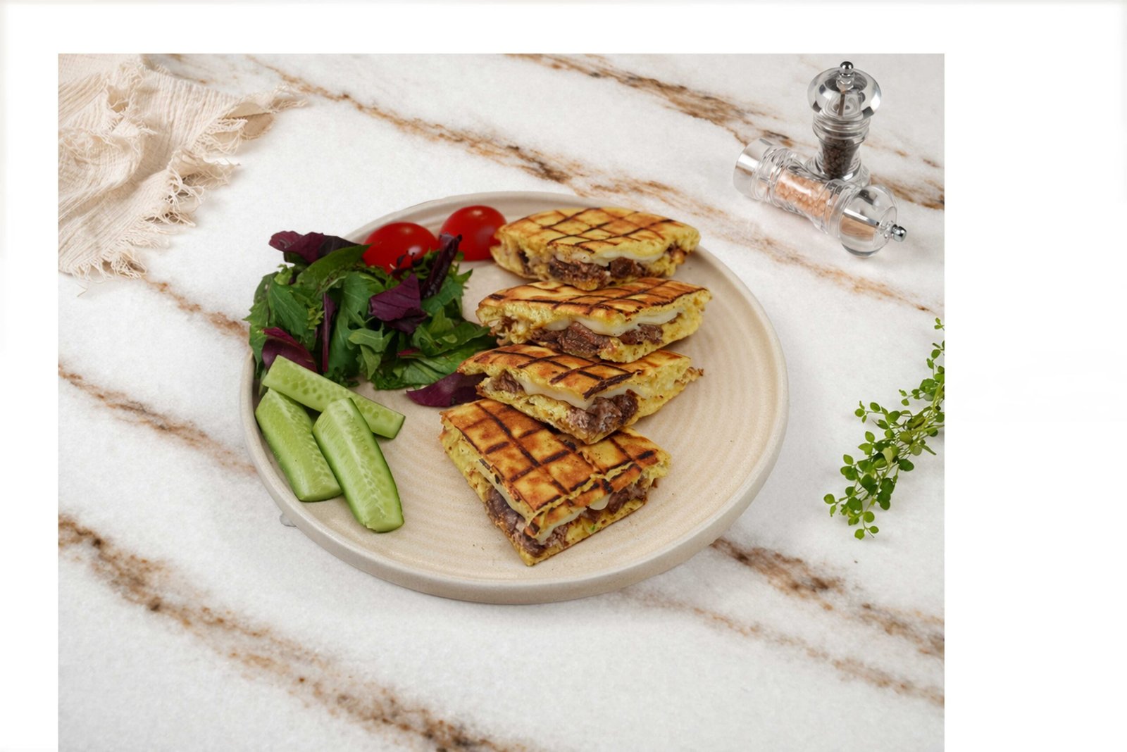 Bazlama ekmeği, dana sucuk, kaşar peyniri, biber salçası , kekik, maskolin, domates, salatalık ile