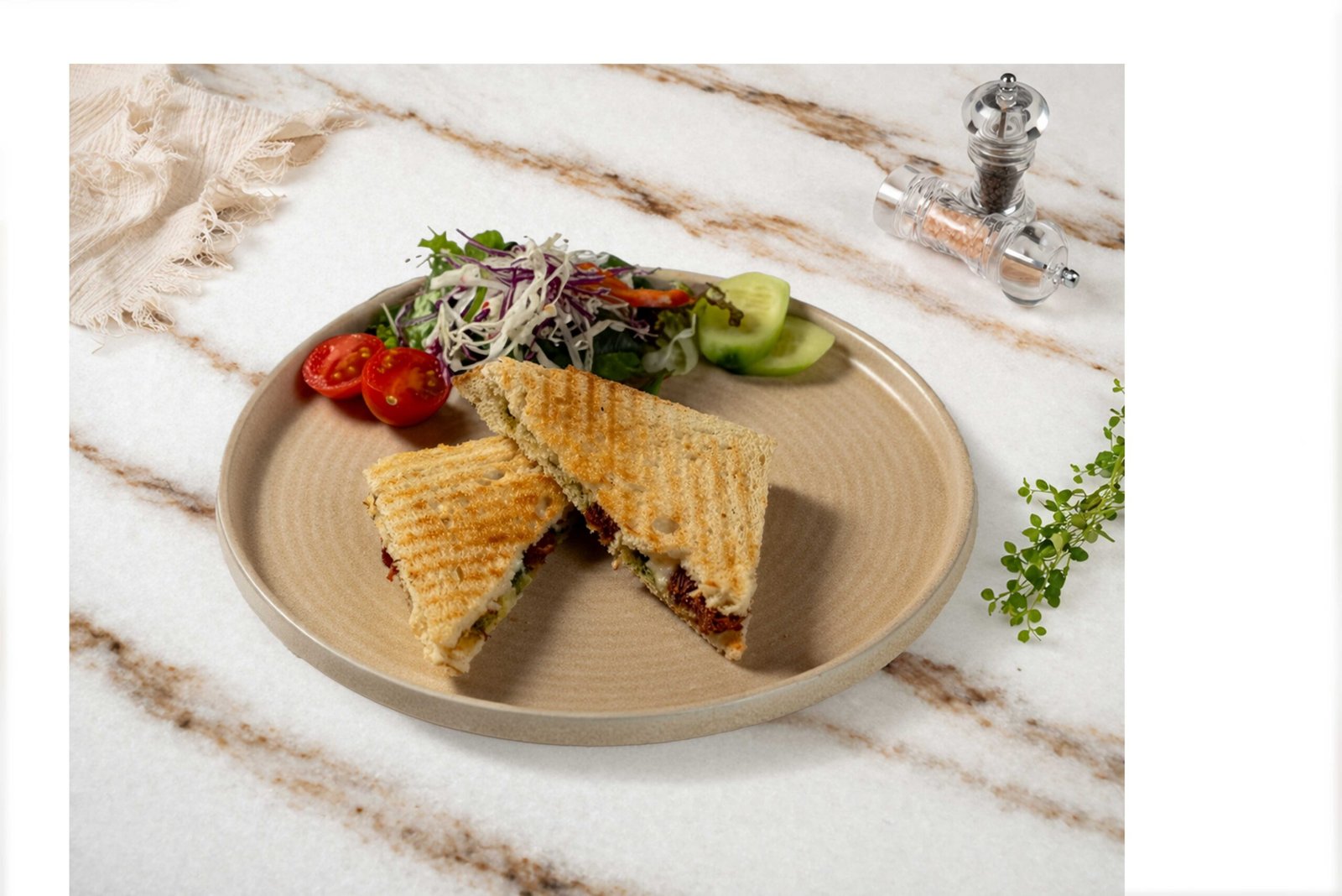 Kepekli tost ekmeği, Ezine peynir, kuru domates, pesto sos, maskolin, çeri domates, salatalık ile