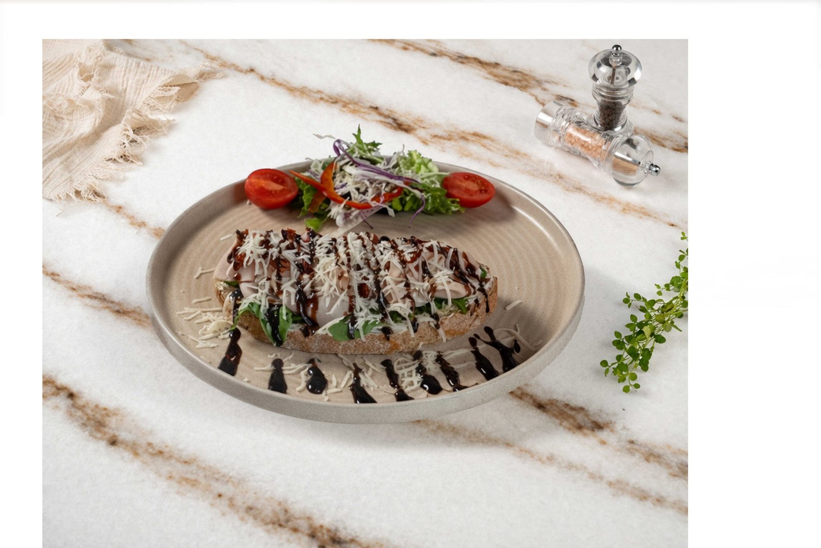 Tam buğday ekmeği, labne, roka, hindi jambon, pesto sos, tulum peyniri, kuru domates, maskolin, çeri domates, salatalık, balzamik glaze ile