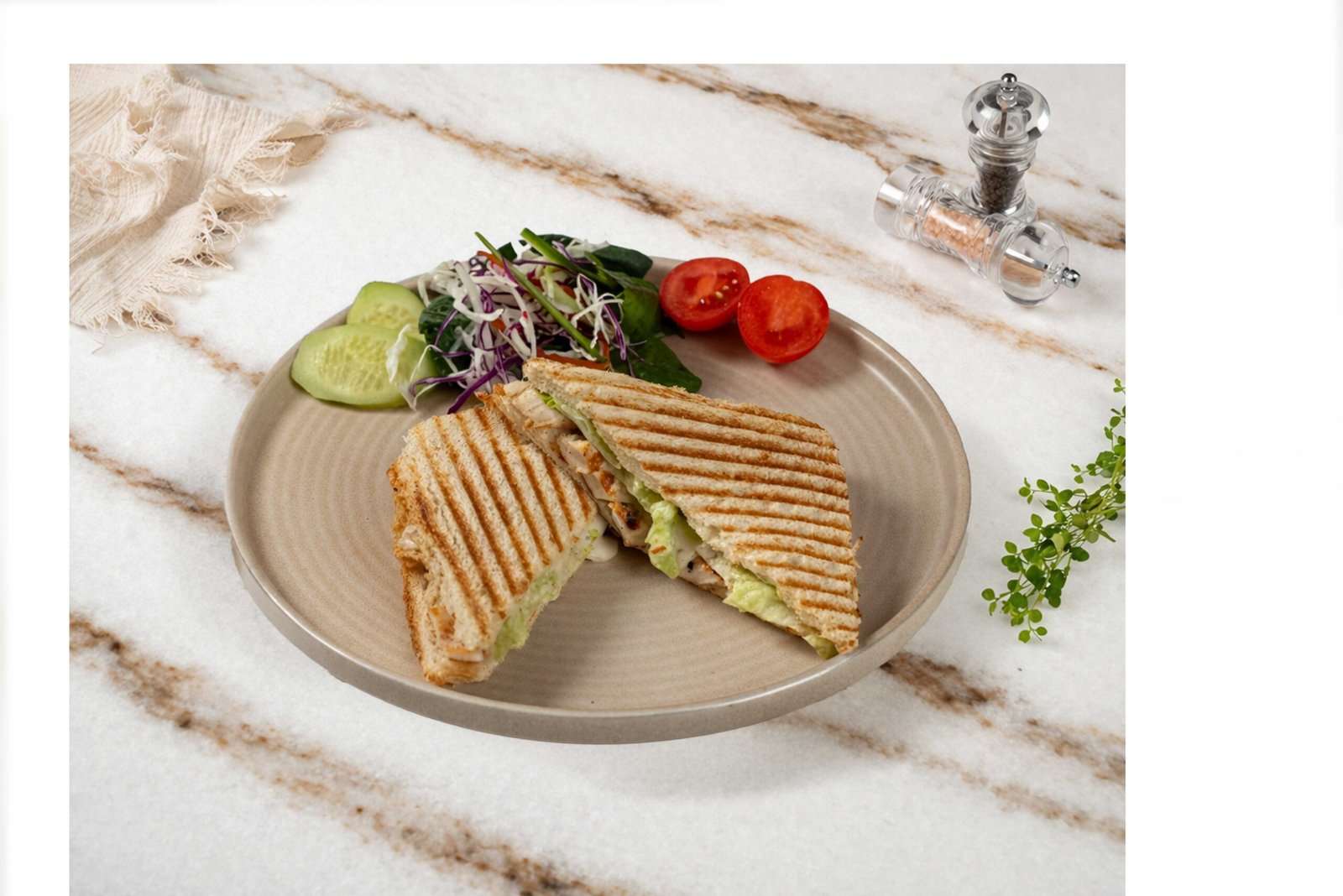 Tost ekmeği, ızgara tavuk, kaşar peyniri, iceberg, sezar sos, maskolin, salatalık, çeri domates ile